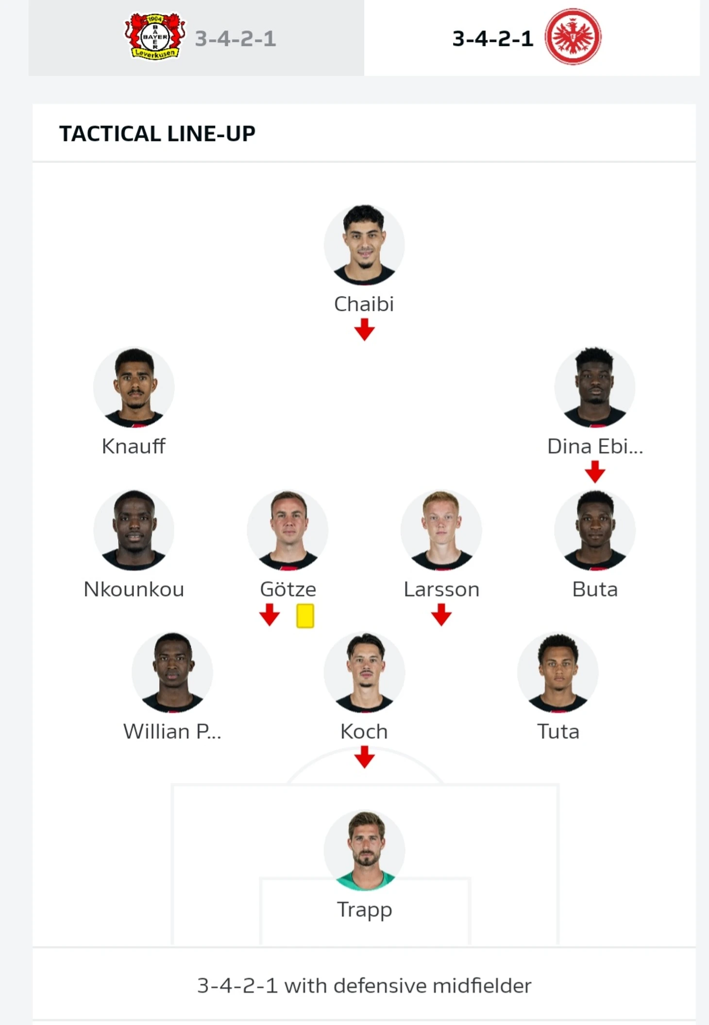 Дино Топпмёллер выбрал для Айнтрахта схему 3-4-3 с гибким центром поля и возможностью перестроиться на пять защитников. В целом же Шаиби поднимался чуть выше вингеров, поэтому Айнтрахт зеркалил схему Байера. В защите вышли Пачо, Кох и Тута. В полузащите заняли свои места Нкунку, Ларссон, Марио Гётце, Бута. В нападении стартовали Кнауфф, Шаиби и Дина Эбимбе. Единственное изменение - это отсутствие Мармуша в стартовом составе.