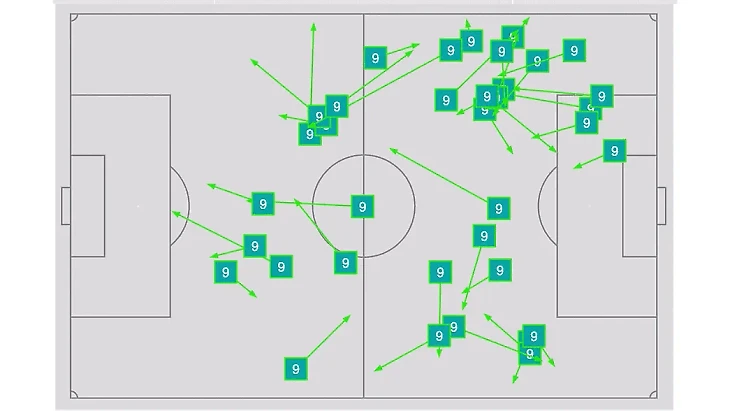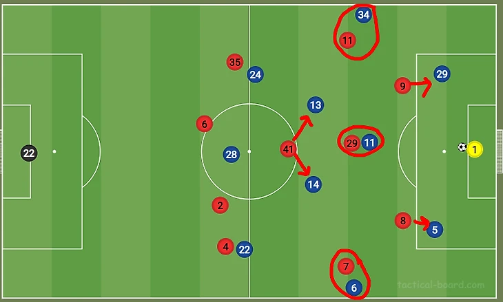 Что произошло за почти 2 минуты. 5 разворотов, ни одной потери мяча, уверенный контроль и ооочень спокойное преодоление прессинга Арсенала. И вот уже гости закрепляются на половине поля хозяев. Очень достойный эпизод. Мне в один момент показалось, что команды играют в большой-большой квадрат на половине поля сине-белых и им все равно, что есть ворота. Но именно так выглядит тактически умный футбол. И вот уже роли меняются: Арсенал пытается преодолеть прессинг, не отдав мяч. Кстати хочу отметить, что у канониров как-то проще модель была, Рая часто просто бил вперед