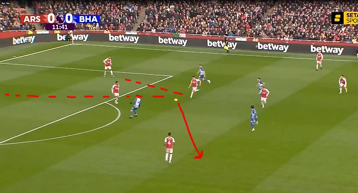 Давайте теперь более подробно разберем формулу Брайтона, их инструменты преодоления прессинга и построения атаки. Во-первых, что делал Арсенал в прессинге: два вингера играют со своими крайними защитниками, Одегаар поднимается как второй форвард, Хавертц забирает опорного, а Райс выбирает игрока в зависимости от стороны развития атаки. Вот наглядно: