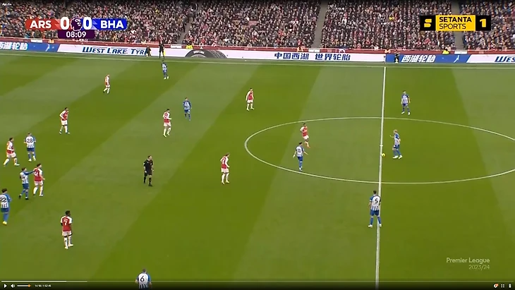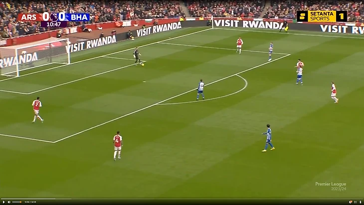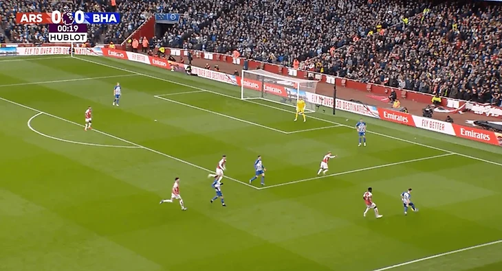 Знаете, когда обе команды не могут играть без мяча, а стиль их игры построен на планомерном продвижении «круглого» от своих ворот до чужих, то такие игры носят особенный характер. Да, в них не особо много интересного для тех, кто смотрит футбол из-за голов, но поверьте, если начать разбираться, что, зачем, для какой цели делает та или иная команда, то начинает затягивать. Матч в Лондоне как раз стал идеальным примером такого противостояния. Уже с первых минут пошла борьба за владение, Арсенал просто понесся вперед, чтобы накрывать соперника. И чтобы вы думали? Брайтон разве начал выбивать или так легко отдавать мяч «канонирам».? Ни капли. Хотя по началу у гостей была какая-то суета, которую я спишу на адаптацию к давлению хозяев. Вот 19-я секунда, гостей просто зажали в углу