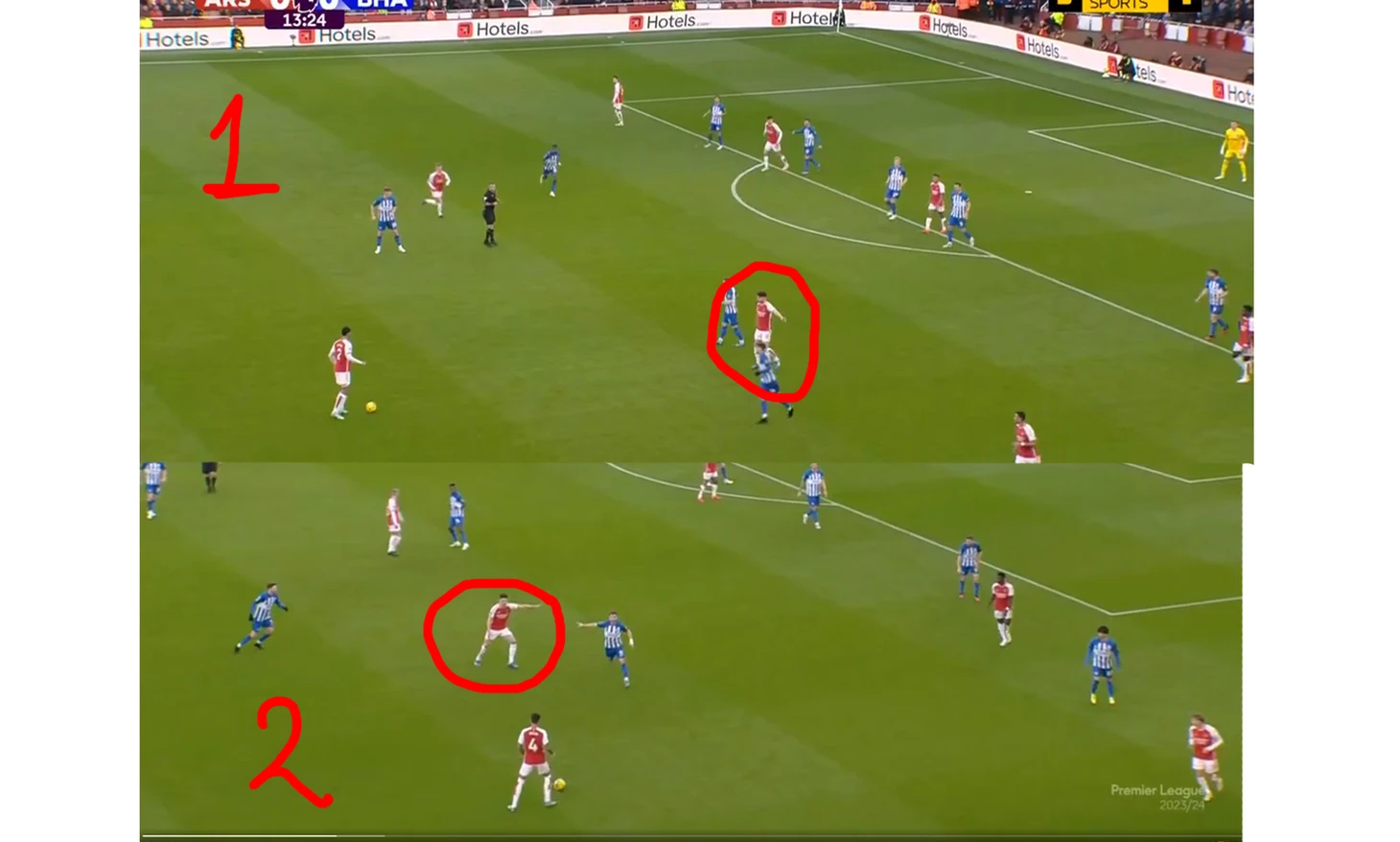 Кажется, что безнадежно выбраться, только если играть на вперед в надежде, что нападающие зацепятся. Но смотрите, что делает Брайтон. Гилмур (очень кстати умный опорник) смещается ближе к полуфлангу, освобождая зону для прихода Гросс, теперь у Хавертца возникает «головная боль» к кому двигаться. Дальше Лаллан делает свой ход, сваливаясь во фланг, противоположный началу атаки, что заставляет уже думать Райза. Но это еще не все, при развороте тот самый умный гилмур сваливается во фланг, чтобы растянуть оборонительный блок Арсенала, тем временем Милнер поднимается вверх, а Митома приходит ниже. Но Гилмур не спешит выходить а снова разворачивает, что заставляет снова хозяев перестраиваться. И так «чайки» делали ровно до того момента, пока у Арсенала не появились разрывы, а гости спокойно вылезли из-под прессинга. Ну гениально же. Вот кстати схематично все показал группе в телеграмм, ссылка в описании к влогу, там еще больше интересных разборов и ивентов. И вот так вот весь первый тайм, одно удовольствие наблюдать за этим умным футболом, а не просто перекидыванием мяча через центр футбола. Представляю ваш вопрос: так почему тогда Арсенал выиграл, если Брайтон такой крутой? Отвечаю: Арсенал тоже умеет грамотно двигать мяч, но самое важное у них есть кому это делать, в отличии от того же МЮ, про проблему которого я писал в предыдущем посте про МЮ. Причем не просто есть, а игроки невероятного уровня. Вот пример Райса, давайте рассмотрим пару моментов. Начнем с простого, развитие атаки. Очень наглядный пример уровня Райса. Он может сыграть назад на своих центральных защитников, вратарю, тем самы сохранив владение, но посмотрите, что он выбирает, идеальный вариант и Арсенал вылетает в стремительную атаку.