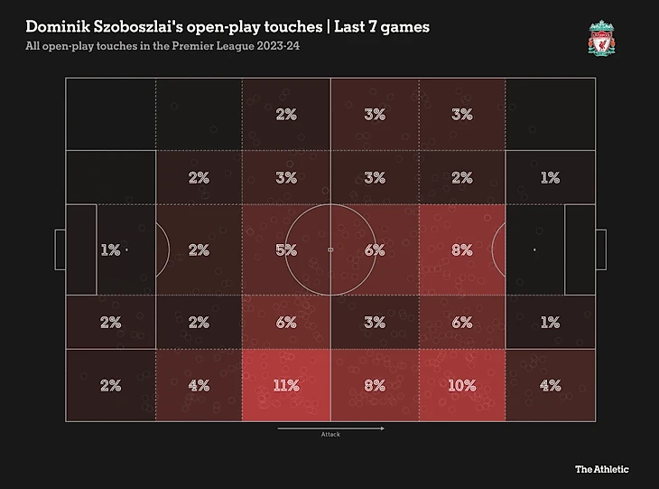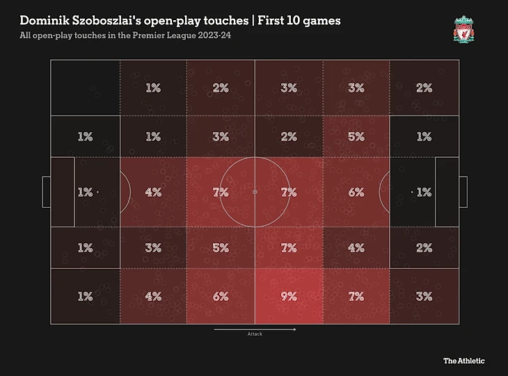 «Ливерпуль» все еще изучает его и его физические возможности, а Собослаи адаптируется к английскому футболу. Если посмотреть на его сенсорные карты, то он проводит гораздо больше времени в широких зонах справа.