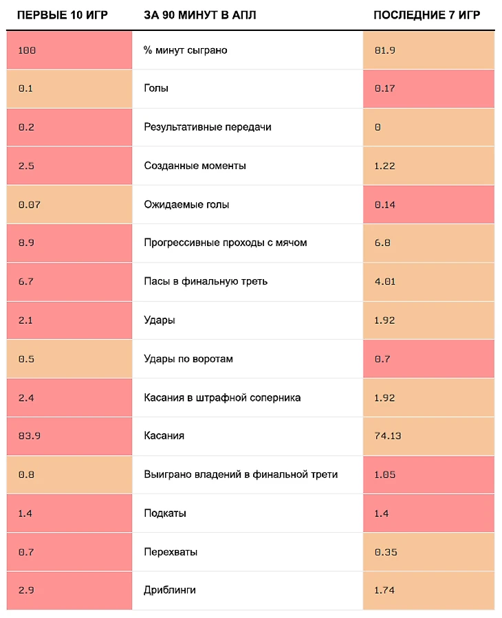 Это далеко не кризис, и Собослаи по-прежнему вносит свой вклад в игру, но наблюдается спад по большинству ключевых показателей — от владения мячом до креативности и атакующего динамизма. Он не отмечался результативной передачей с 29 октября, а с 3 сентября забил всего один гол.