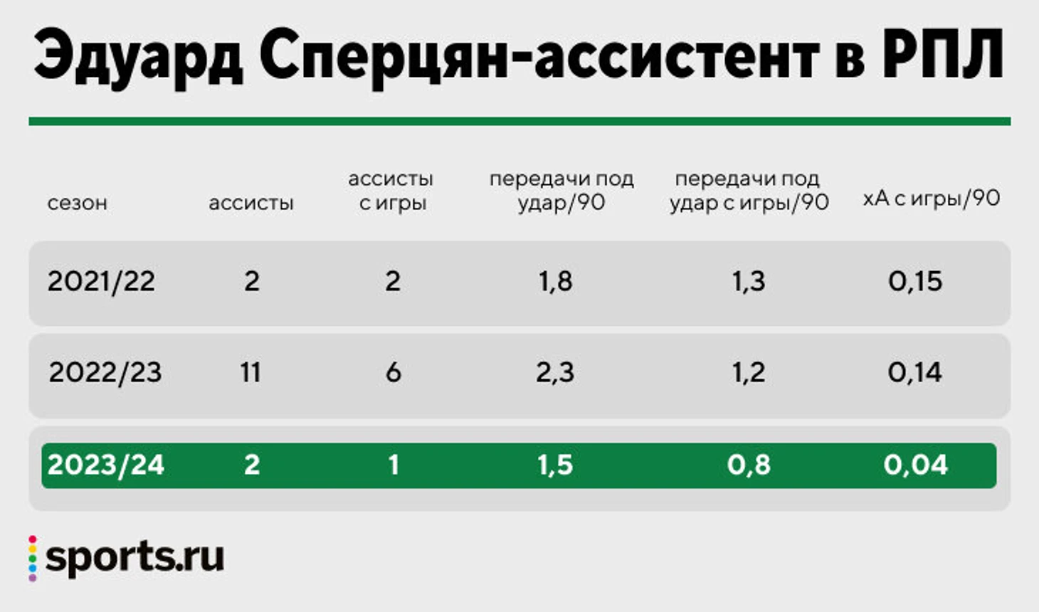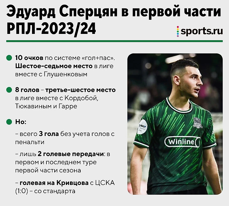 Полгода спустя Сперцян – лидер сенсационного зимнего чемпиона РПЛ и один из лучших по системе «гол+пас» (6-е место вместе с Максимом Глушенковым). Но кое-что в статистике Эдуарда смущает.