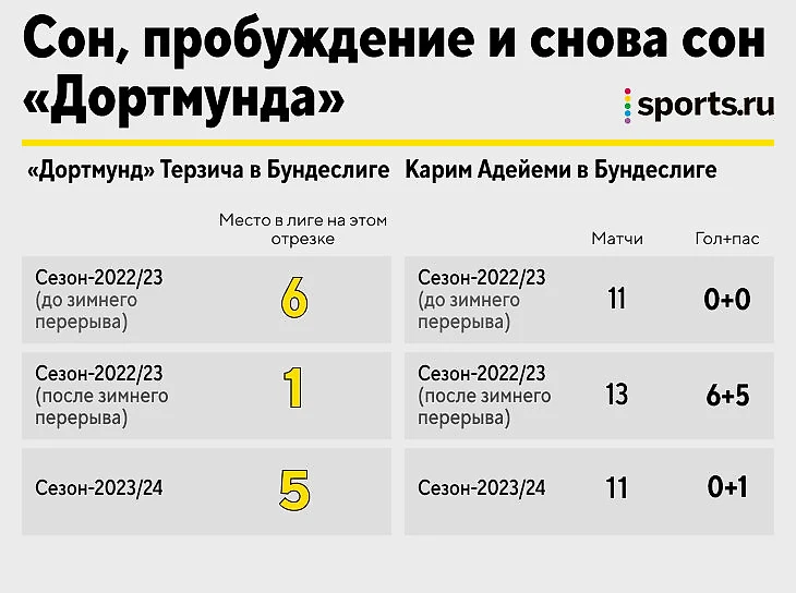 Происходящее с «Дортмундом» при Эдине Терзиче напоминает фильм «Пробуждение» с Робертом Де Ниро и Робином Уильямсом. Фабула: пациенты, пострадавшие от эпидемии летаргического энцефалита, долгие годы находились в подобии кататонического ступора, не разговаривали и не двигались, благодаря экспериментальному лекарству все-таки вернулись к нормальной жизни, но вскоре откатились к обездвиженному состоянию. «Дортмунд» спал осенью-2022, проснулся весной-2023 и снова заснул осенью-2023. Это сравнение идеально иллюстрирует Карим Адейеми.