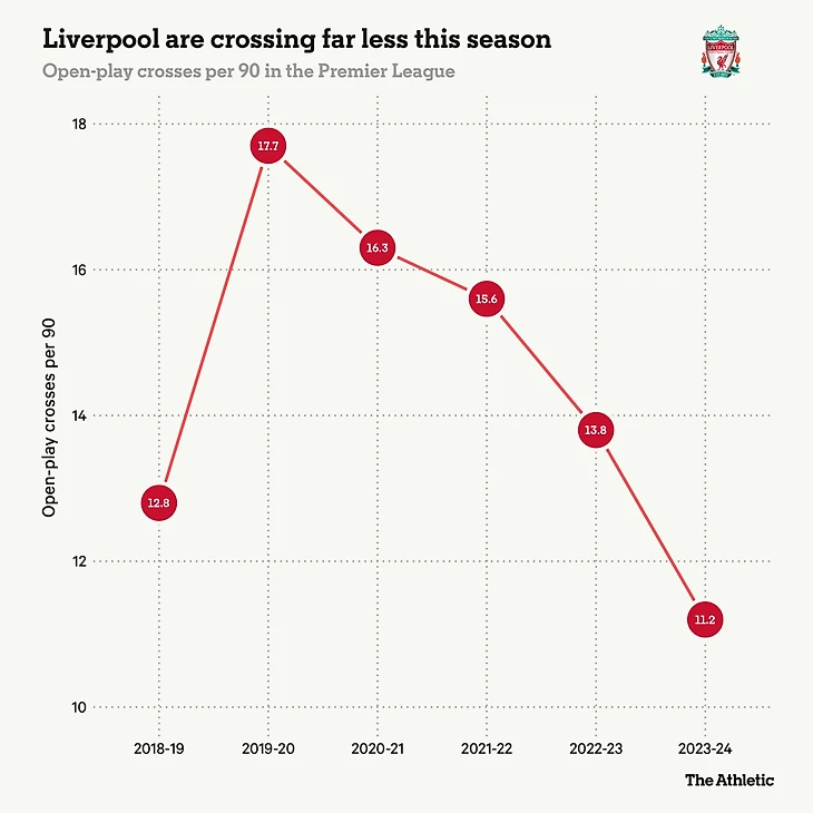 Неудивительно, что количество кроссов значительно снизилось по сравнению с предыдущими сезонами. В то время как «Ливерпуль» в среднем делал 17,7 навесов за 90 минут в кампании 2019/20, когда они выиграли лигу, в этом сезоне он был ниже, чем в любой другой в эпоху Клоппа, всего 11,2.