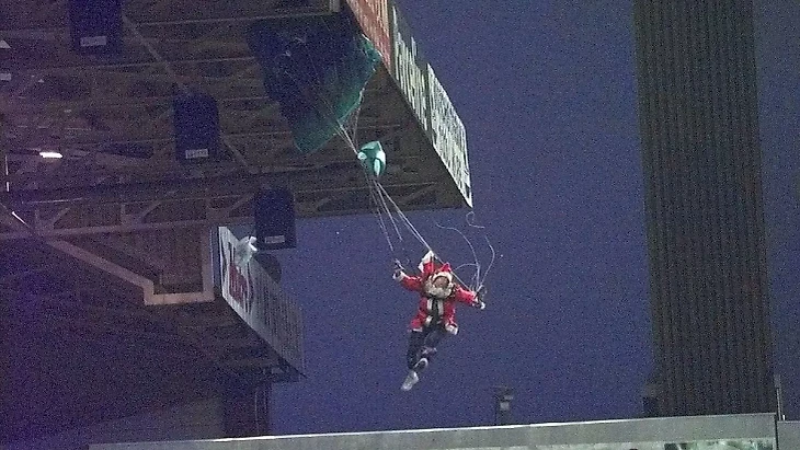 Парашютист в костюме Деда Мороза грохнулся на дорожку между полем и трибунами. С 30-метровой высоты.