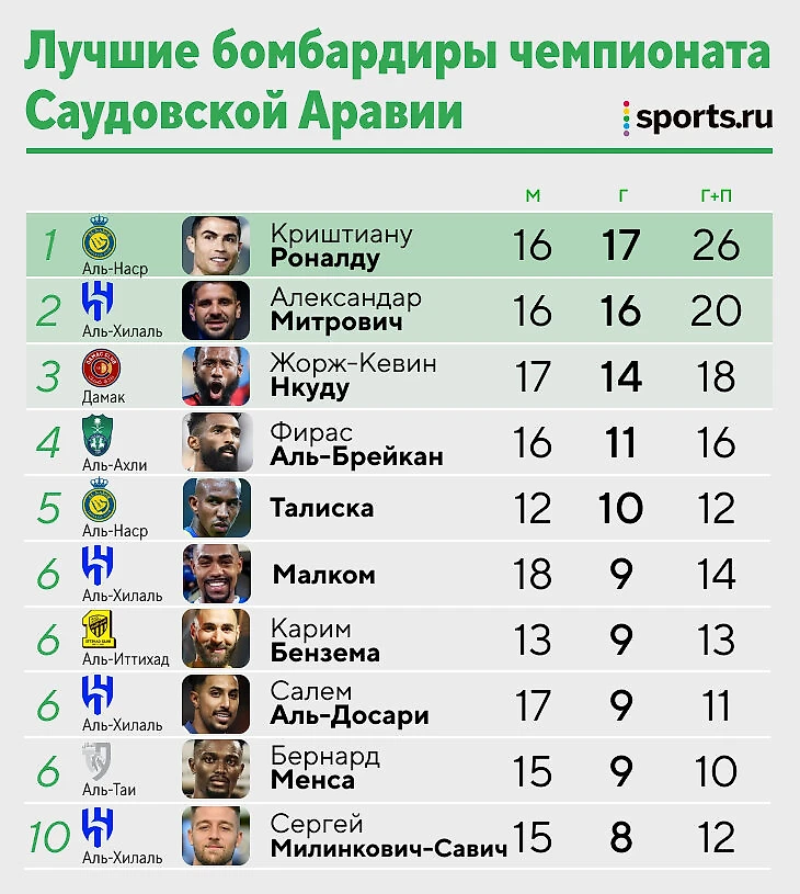 Как дела в Саудовской Аравии? Роналду не первый, у лидера +10 очков, Бензема и Малком рядом в гонке бомбардиров