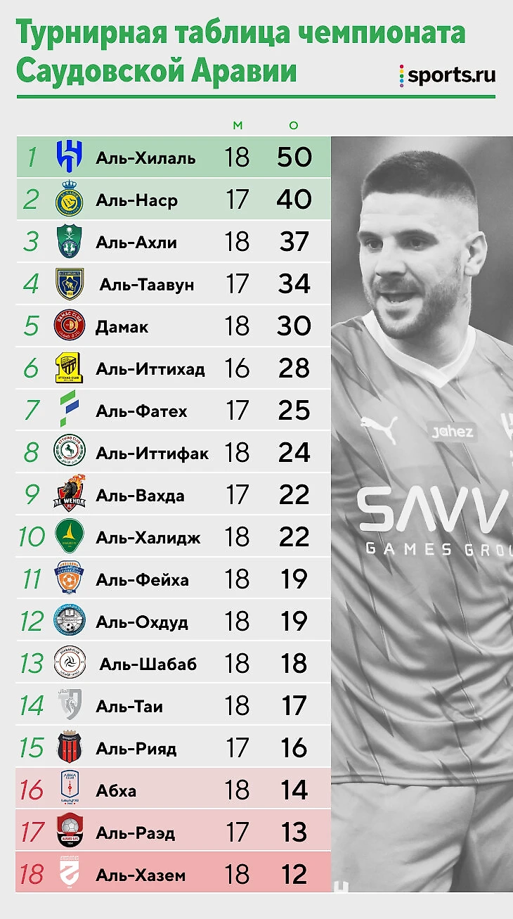 ● «Аль-Фатех» Славена Билича седьмой, «Аль-Шабаб» Эвера Банеги – 13-й. В зоне вылета помимо «Абхи» идет «Аль-Раэд», куда летом переместился Матиас Норманн, и «Аль-Хазем».