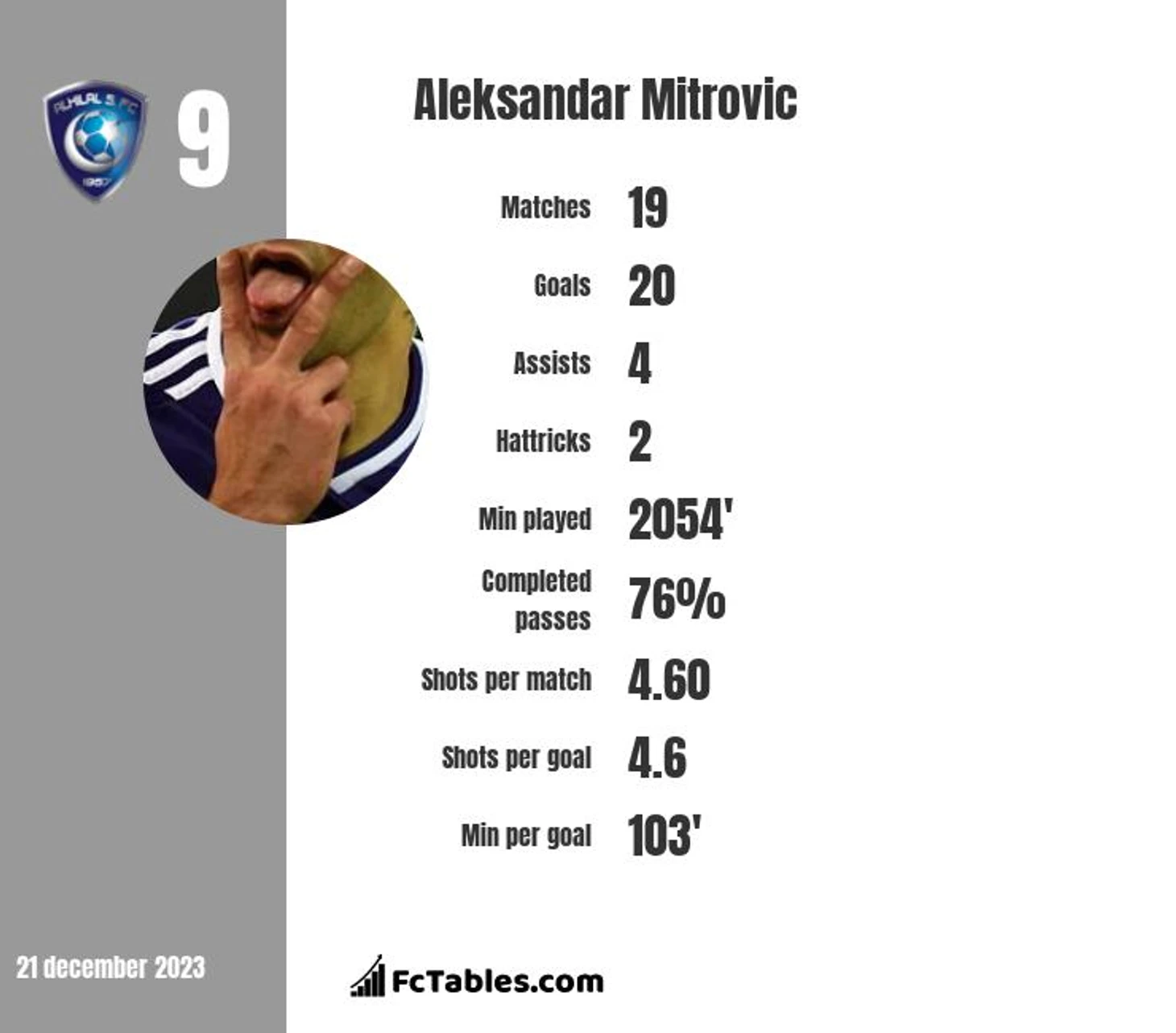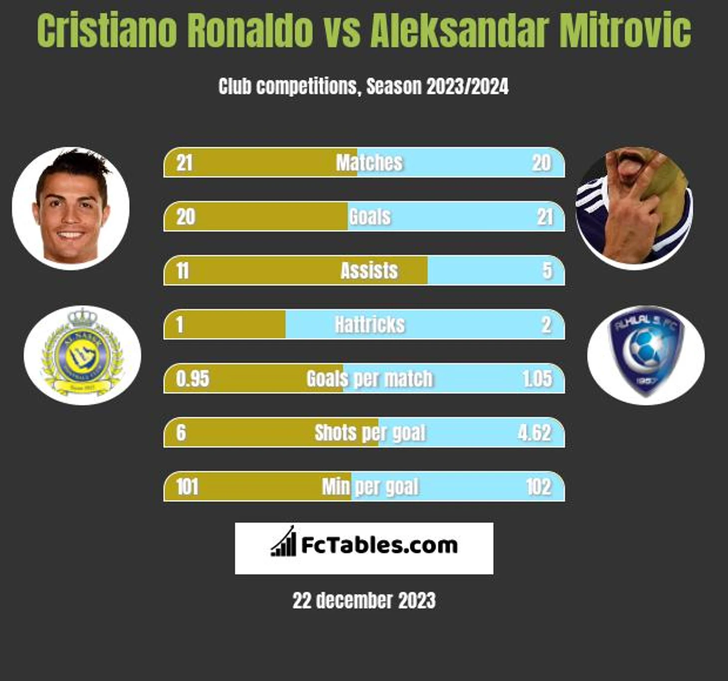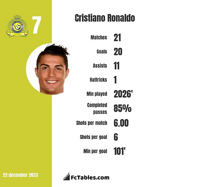 Голы на 90 минут:0,95 голов у Роналду против 1,05 голов у Митровича .2-2