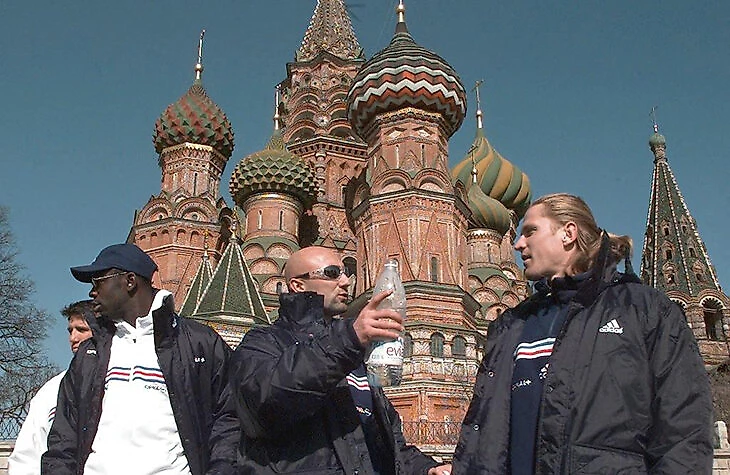 Вот Лилиан Тюрам, Фабьен Бартез и Эмануэль Пети у Собора Василия Блаженного.