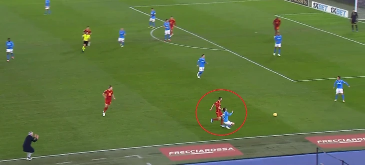 На 66-й Политано ударил Николу Залевского высоко поднятой ногой – аут сразу. А через 20 минут вторую желтую получил Осимхен, сбивший сзади Стефана Эль-Шаарави. Включая тренеров – восемь желтых карточек у «Ромы», три желтые и две красные – у «Наполи». Весело.