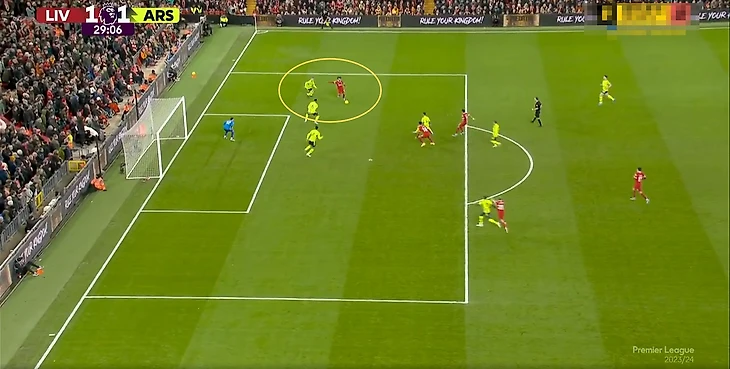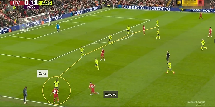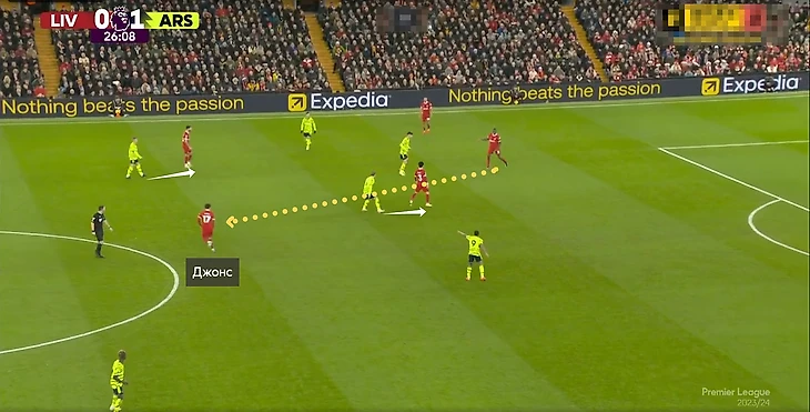 Ещё одной важной деталью была свобода Кёртиса Джонса. В прессинге «Арсенал» ориентировался на перекрытие Эндо и Собослаи, из-за чего Джонс часто получал свободу. Например, здесь «Ливерпуль» через англичанина вышел из обороны в атаку.
