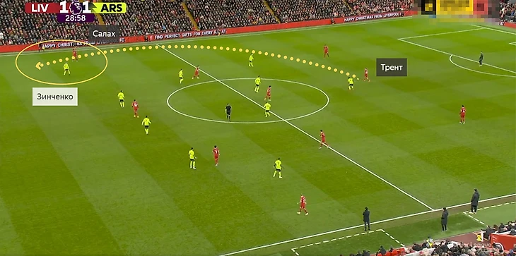 Гол «Ливерпуля» пришёл из ситуации, когда англичанин получил свободу и возможность выполнить длинную передачу из глубины. Трент направил мяч на Салаха, который оказался 1 в 1 против Зинченко (не самого сильного в оборонительном плане игрока). Дальше Мо сместился в центр и забил.