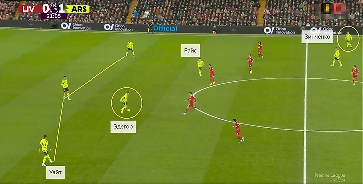 С мячом команда Артеты немного видоизменила структуру по сравнению с привычным режимом. Зинченко реже обычного становился ложным фулбеком. Украинец часто не шёл в опорную зону, а располагался на фланге в роли классического крайнего защитника. Вероятно, Артета боялся оставлять много свободы Салаху на фланге. В пару к Райсу в опорную зону в таких ситуациях опускался Эдегор.