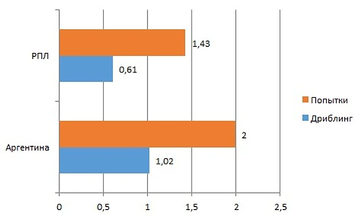 Видно что в Аргентине в 1.5 раза больше попыток дриблинга, при примерно одинаковом проценте