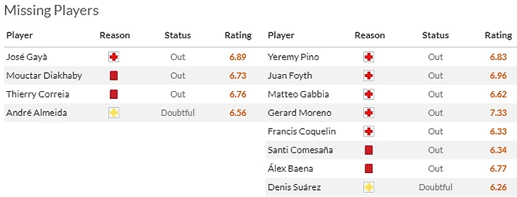 На что обратить внимание: На зимний трансферный рынок. Субмарина решила, что заткнет дыру в своей оборонительной ватерлинии Эриком Байи. Да-да тем самым, который сбежал с Подводной лодки в Манчестер Юнайтед. И сплавила Маттео Габбию(5,5) обратно в Милан уже этой зимой. Кроме того не поедут в Валенсию предусмотрительно самодисквалифицировавшиеся Баэна(6,5) с Комесаньей(6) и приболевшие Серлот(7,5) с Педрасой(6). Хорошо хоть Жерар Морено(8) в строю.