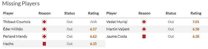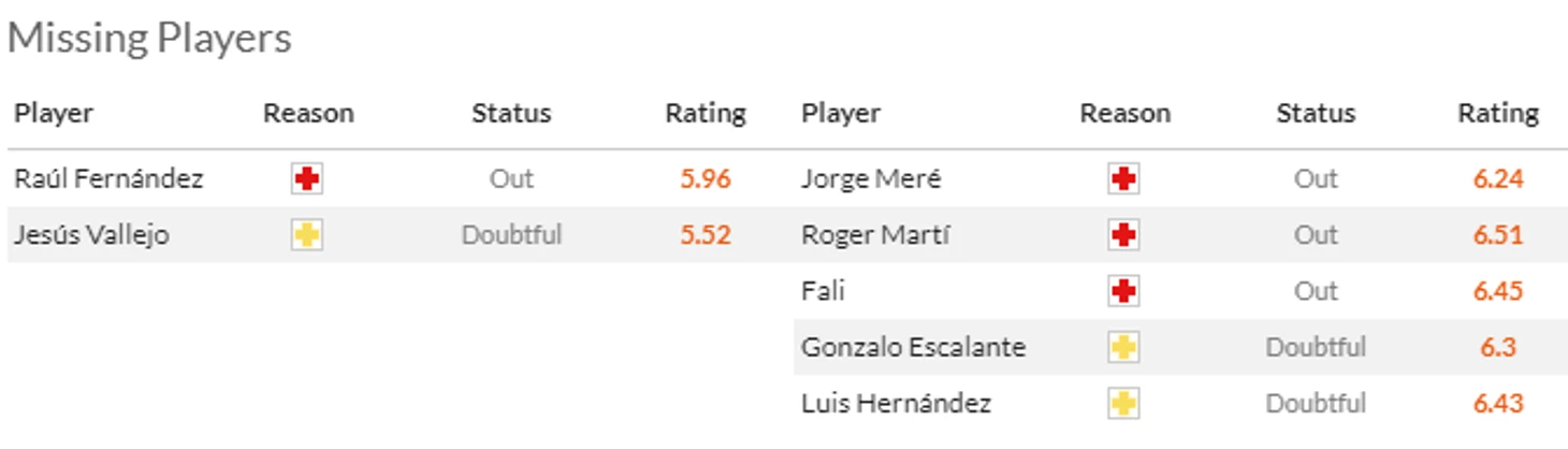 Занятно что у Мальорки ситуация скорее обратная: до сих пор кукуют на больничном лидер клуба Ведат Мурики(7,5) и основной центральный защитник Вальент(5,5). Ну и до кучи не полетит в Мадрид забаненный Жауме Коста(5,5).