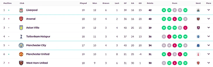 После 19-ти встреч «Ливерпуль» лидирует в английском первенстве. «Арсенал», главный преследователь команды Клоппа, отстает от мерсисайдцев на два очка, но имеет игру в запасе.