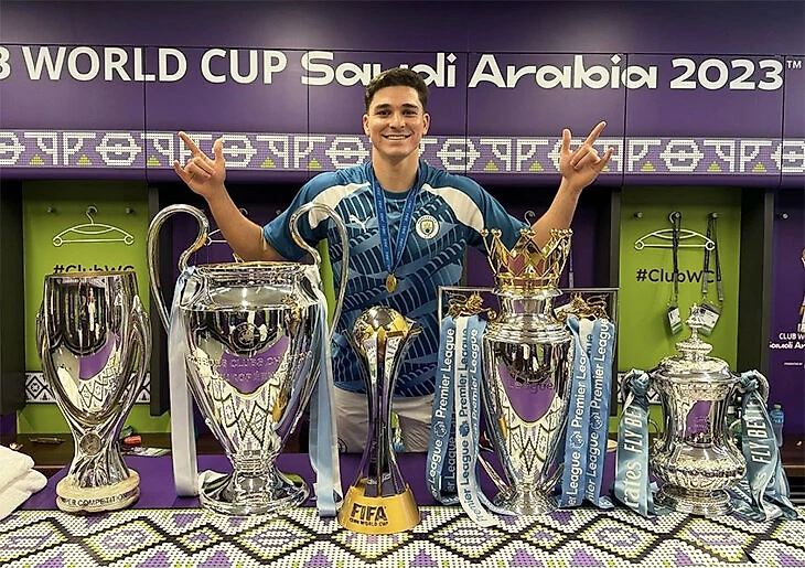 В Англии у Альвареса пять титулов: в сезоне-2022/23 выиграл АПЛ, Кубок Англии и ЛЧ, дальше добавил Суперкубок УЕФА-2023 и КЧМ-2023.