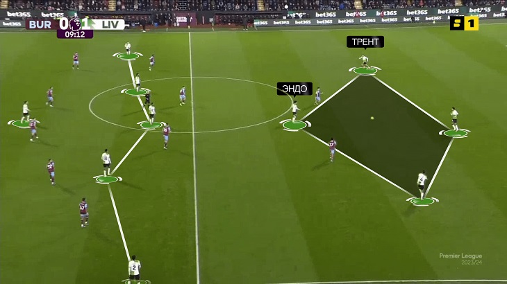 Еще одним интересным нюансом стали перемещения Трента. Мог занять все четыре позиции в розыгрышей – каждого в тройке ЦЗ и опорника, когда Эндо опускался в защиту. Оцените на скриншотах выше.