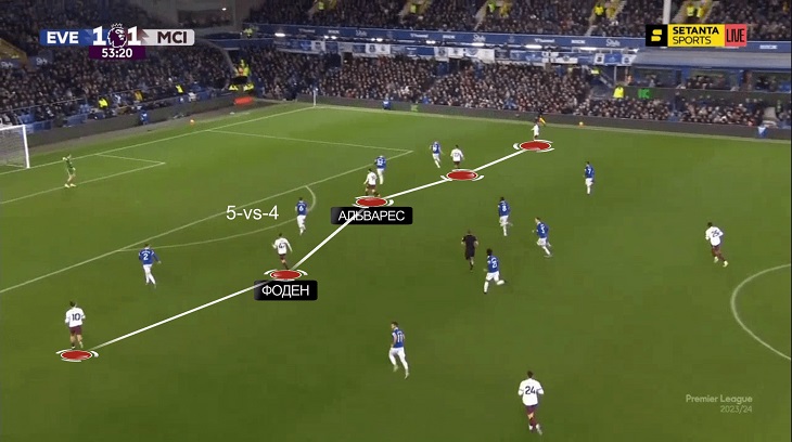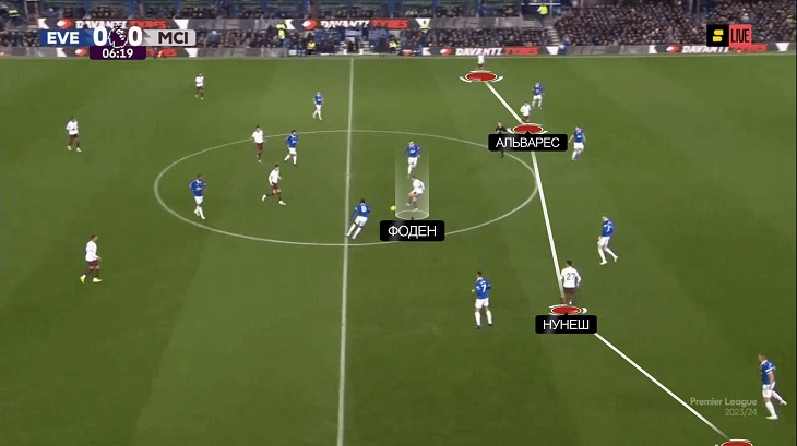После матча Пеп аргументировал решение тем, что защитники «Эвертона» играют очень агрессивно и постоянно выдергиваются. Задачей Фодена было стягивать одного из них и создавать пространство для рывков Альвареса и игравшего на зеркальной позиции Матеуша Нунеша.