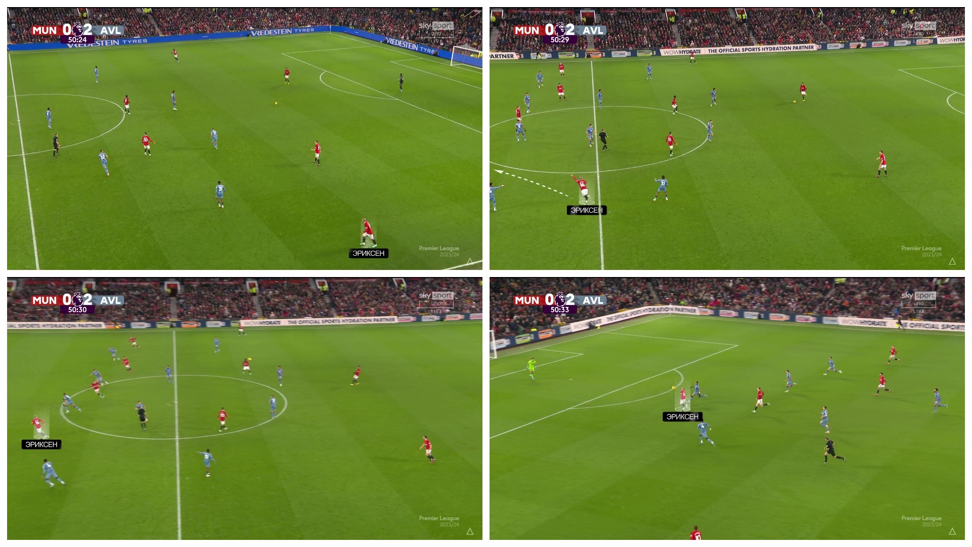 Это означало игру вообще без центра и насыщение последней линии рывками. Подобная ситуация повторялась с пугающей регулярностью. А плеймейкером в целях экономии времени мог выступить практически любой (даже Онана). Вот классика – Эриксен нашел пространство на фланге, ему создаются варианты, следует пас за спину:
