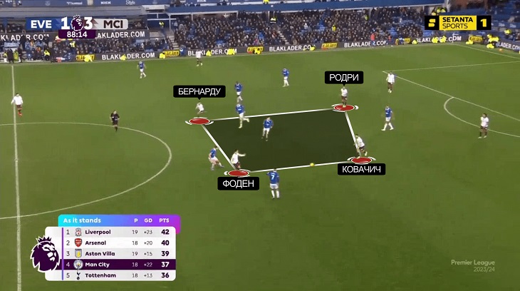 На заключительном отрезке Пеп предложил еще один вариант. Чтобы успокоить пыл хозяев, Гвардиола выставил в центре поля квадрат из супертехничных Родри, Ковачича, Бернарду и Фодена.