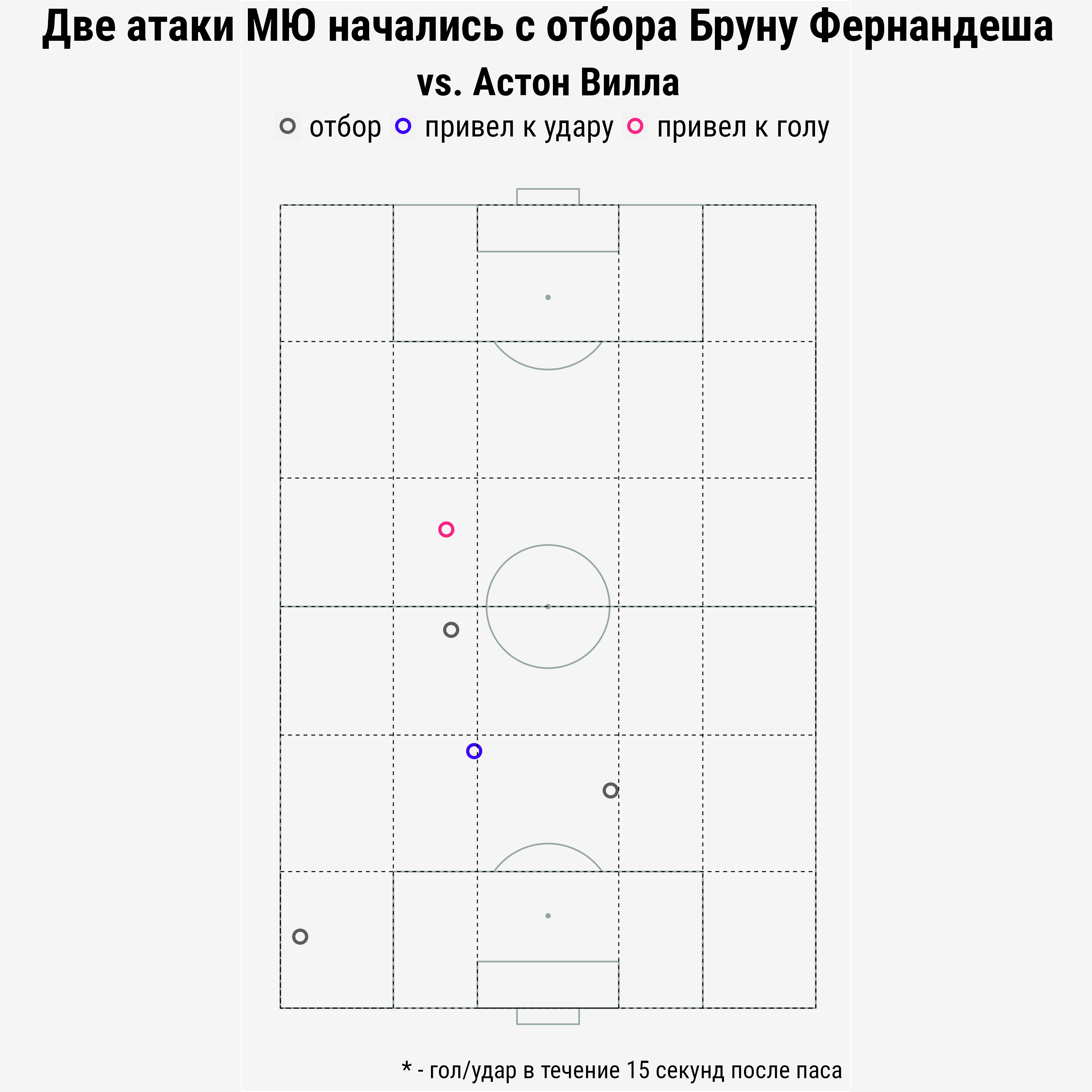 А вот карта отборов Фернандеша – две атаки, включая первую голевую, начались с того, что он успешно поборолся за мяч. Кстати, против «Виллы» у Бруну 100-процентный успех подкатов – три из трех.