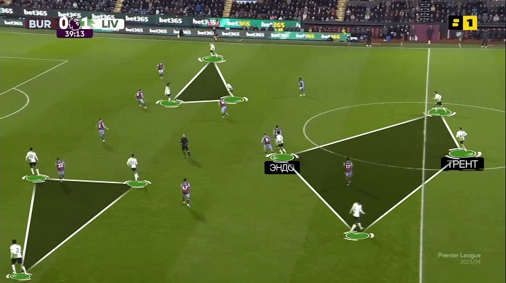 В том числе структура помогала с созданием моментов. Первый прием – передачи Трента и Ван Дейка за спину: «Бернли» опасался потерять нападающих «Ливерпуля» и потому давал им свободу. Вторая опция – розыгрыши в треугольниках. Благодаря атакующей шестерке получалось создавать на обоих флангах.