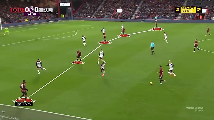 Схема и принципы не меняются, а вот наполнение становится более смелым. Новый шаг: атакующий вингер Данго Уаттара – слева в защите. При владении уходит в атакующую пятерку, где занимает широкую позицию на левом фланге: