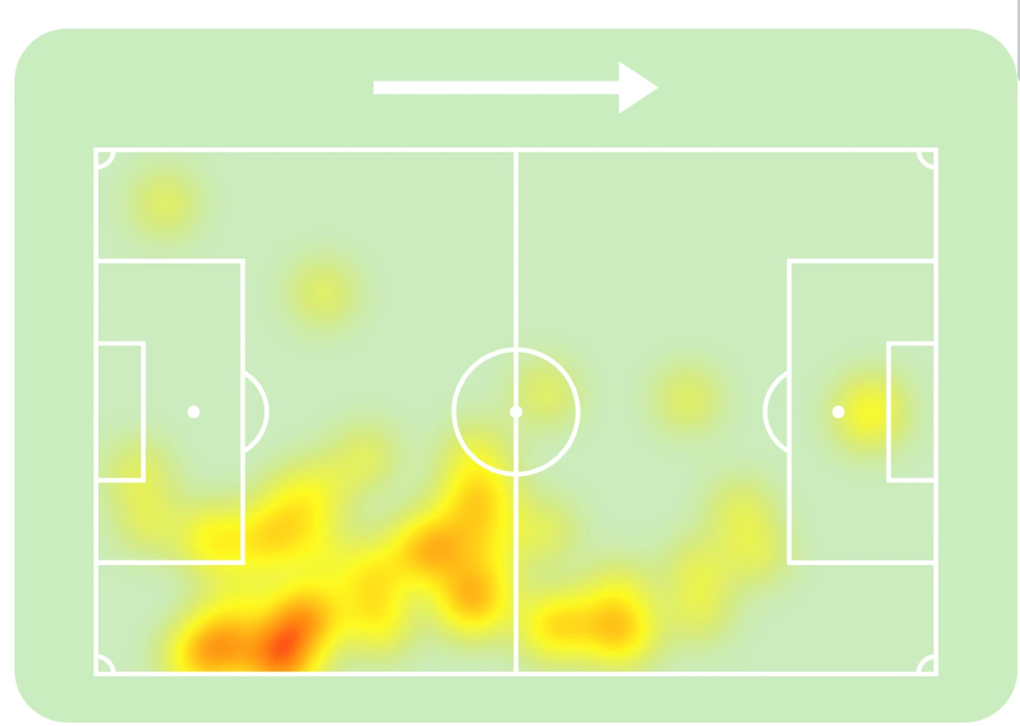 Вот карта точных передач Фернандеша (здесь нет второго и третьего гола, потому что пасы были неточными). В 7 случаях его действия приводили к ударам.