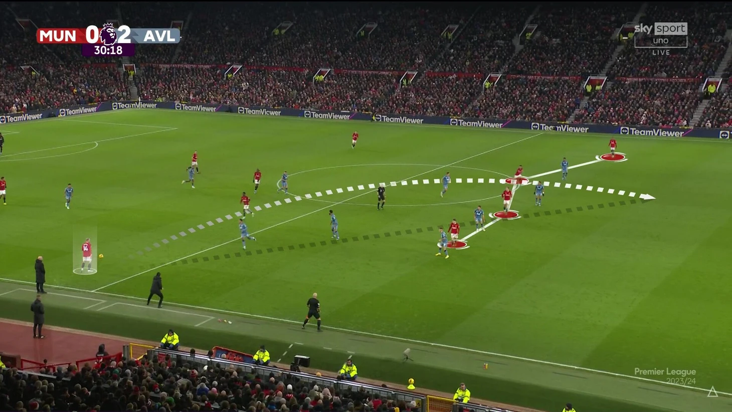 Аналогичным образом «МЮ» вертикализировал игру сразу после возвратов мяча. Такая картина не только перегрузила «Виллу», но еще подходила качествам игроков «МЮ». Вся тройка атаки (Рэшфорд, Хейлунд, Гарначо) хороша в подобных открываниях, как правило их рывками из глубины поддерживали полузащитники или фланговые защитники.