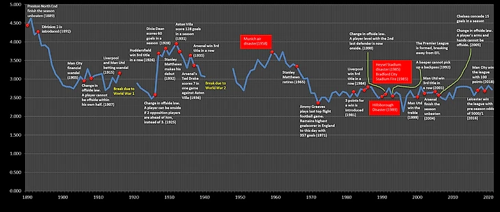 P.s. Еще один интересный график - статистика средней результативности чемпионата Англии за всю историю (до 2020 года)