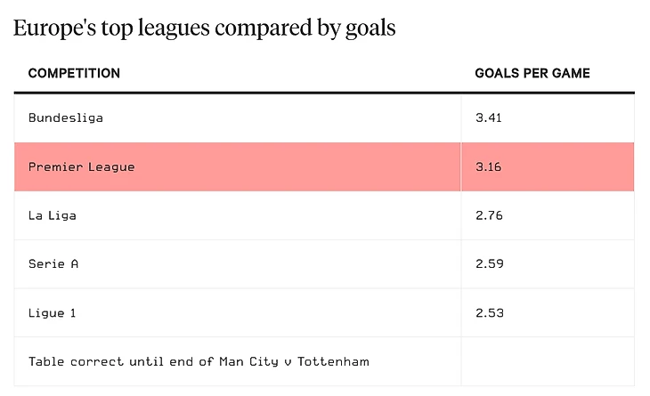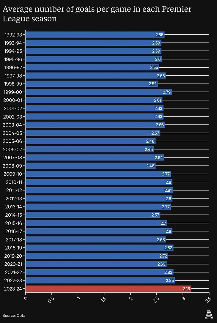 На the Athletic в начале декабря была статья, в которой привели статистику средней результативности за всю историю АПЛ и промежуточную цифру по сезону 2023-24 - 3.16 голов в среднем за игру.