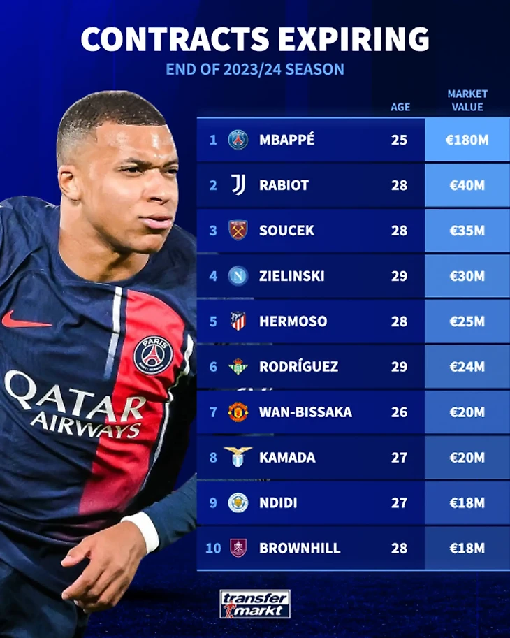 Вот топ самых дорогих футболистов, чьи контракты истекают летом 2024 года (по версии Transfermarkt):