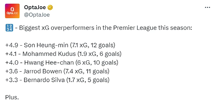 Форвард «Тоттенхэма» Сон Хын Мин возглавил топ самых удачливых игроков английских клубов. При семи с небольшим ожидаемых голов южнокореец забил двенадцать раз. Следом за ним идет Мохаммед Кудус из «Вест Хэма» с разницей 4,1. Третье место у игрока «Вулверхэмптона» Хван Хи Чхана − 4.