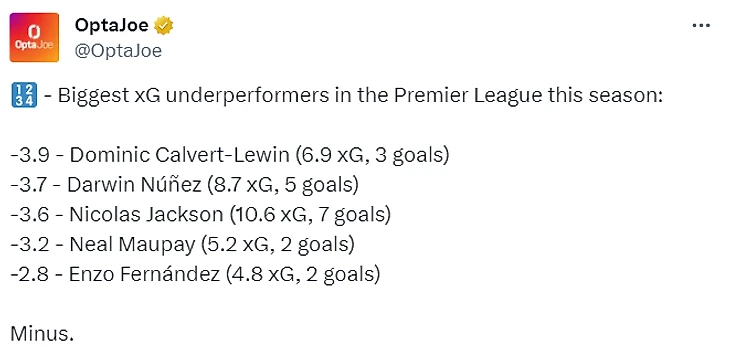 Любой фанат АПЛ знает не понаслышке, что самые серьезные проблемы с реализацией у форварда «Ливерпуля» Дарвина Нуньеса, однако в рейтинге он лишь второй, уступив первенство игроку «Эвертона» Доминику Кэлверту-Льюину (-3,9 против -3,7). При этом форвард синей стороны Мерсисайда и создал, и забил меньше своего коллега с его красной половины.