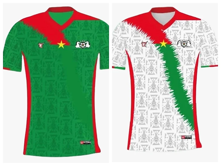 Новая форма сборной Буркина-Фасо напоминает предыдущую, но теперь вертикальная полоса (цветов флага) не ровная, а изогнутая. Звезда − тоже отсылка к флагу.