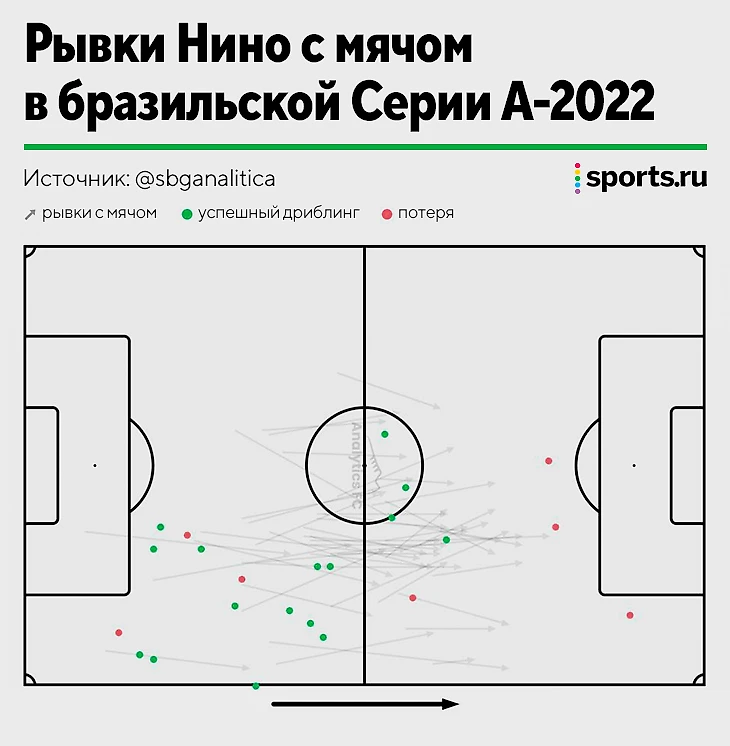 Хотя Нино – не плеймейкер вроде Ренана или Ярослава Ракицкого. Он неплохо забрасывает, качественно переводит на фланги, но стиль Нино – в более простых передачах. Бразилец легко отдает партнерам под давление, потому что мгновенно открывается для создания дополнительного коридора, доверяет вратарю и ищет опорников коротким передачами. Редко катит вразрез, хотя при необходимости исполняет и совсем не боится прессинга.
