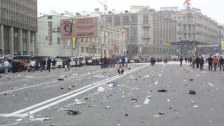 При этом поражение, безусловно, нельзя было назвать катастрофой. Предстоял еще матч с Бельгией. Но то, что произошло в центре Москвы после финального свистка игры с японцами, затмило все... В тот воскресный день футбол транслировали на четырех экранах — на Арбате, Поклонной горе, Триумфальной площади, но самая большая толпа скопилась на Манежке, примыкающей к Красной площади и Кремлю. Перед матчем свободно продавалось спиртное в бутылках. На столичных улицах не ставили никаких магнитных рамок, не производили досмотр, и к середине дня на площади рядом с гостиницей «Москва» собралось около 15 тысяч человек. Сборище было абсолютно стихийным, и милиция совершенно не позаботилась о безопасности, перекрыв перекресток Моховой, Тверской улиц и Охотного ряда лишь за 10 минут до стартового свистка. Перед этим на экране демонстрировали отрывок из фильма «Большой Лебовски», где один из героев крушит автомобиль кочергой. Впоследствии многие восприняли тот ролик как призыв к действию. Сигналом к началу насилия на Манежке стала взорвавшаяся вдруг дымовая шашка, после чего о футболе просто забыли.