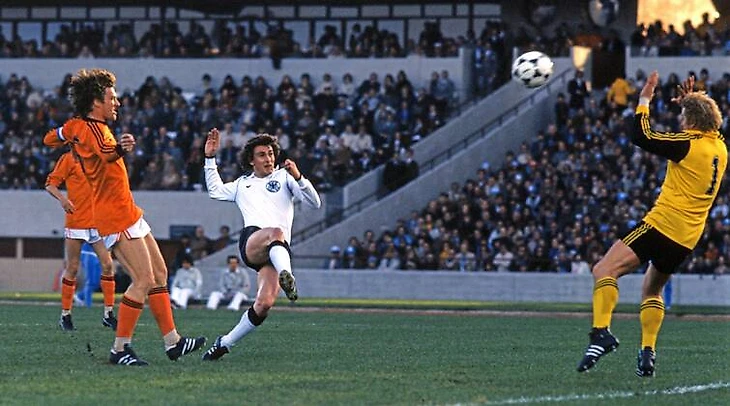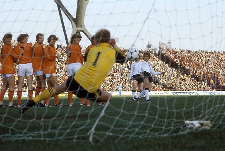 67-я минута. Румменигге в штрафной голландцев не может уйти от Крола и отыгрывается назад на Хёльценбайна. Полузащитник немецкой сборной в сопровождении Янсена смещается в центр вдоль линии штрафной и наносит удар по воротам. Слишком неточно