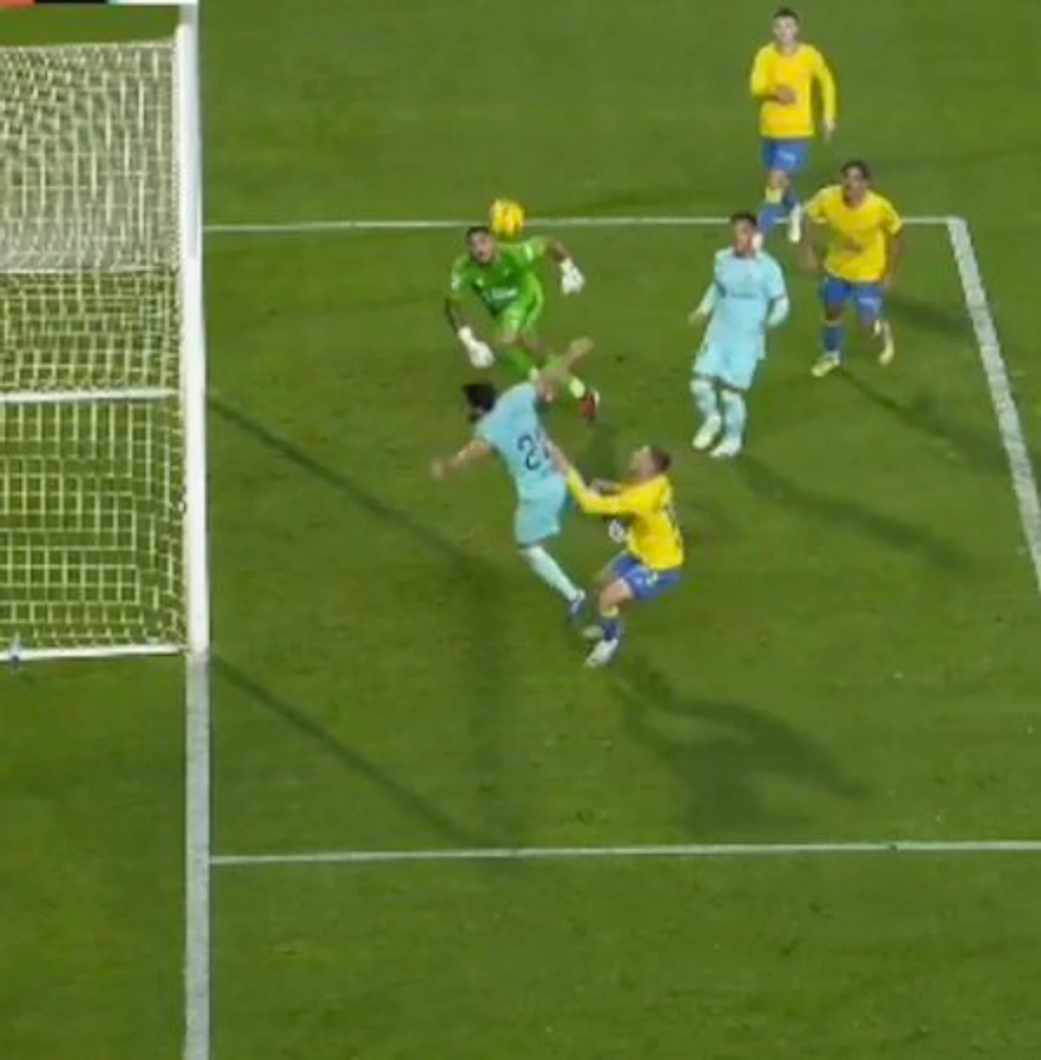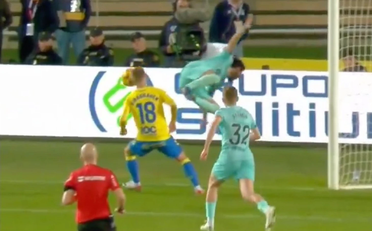 На 91-й «Барса» заработала пенальти! Игрок «Лас-Пальмаса» толкнул Илкая Гюндогана, когда тот подлетел, чтобы внести мяч в пустые ворота. И как же забавно выглядел этот полет!