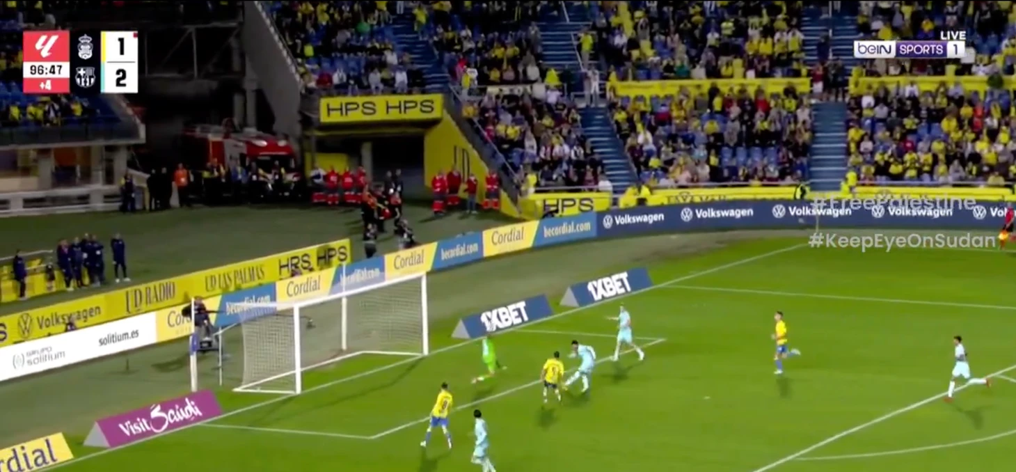 В самом начале матча «Барселона» потеряла одного из ключевых игроков – Жоау Канселу получил травму, одновременно ударив по мячу вместе с игроком «Лас-Пальмаса» Максимо Перроне. Врачи не помогли: португалец вернулся в игру, но моментально рухнул и попросил замену.