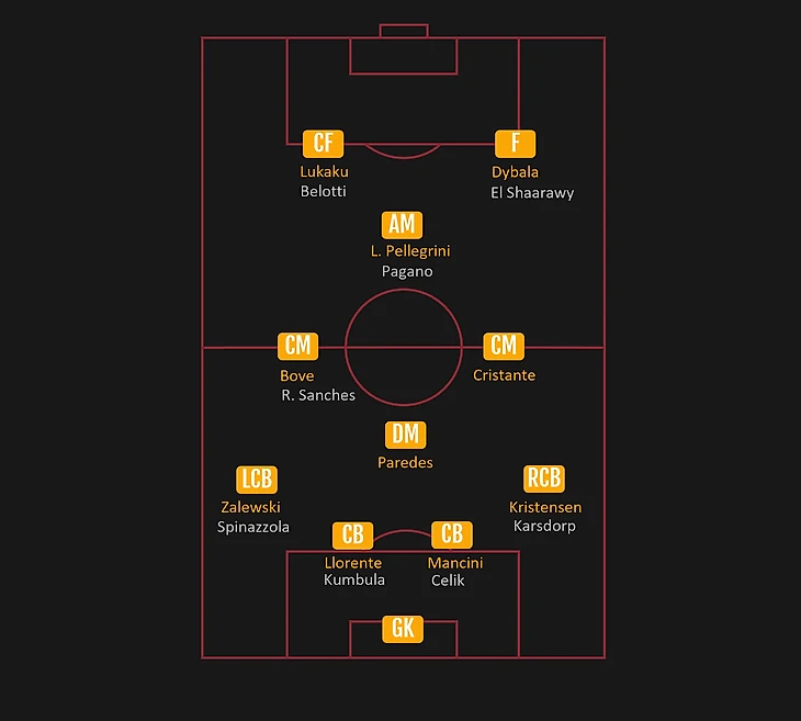 Оборонительная четверка в линию снимает кандалы с Кристанте и освобождает его для игры в полузащите. Помощь в билдапе, любимые подключения в штрафную, возможно, более высокая позиция, но с сохранением связки с Паредесом, как и хочет видеть Жозе в текущей версии 5-3-2.