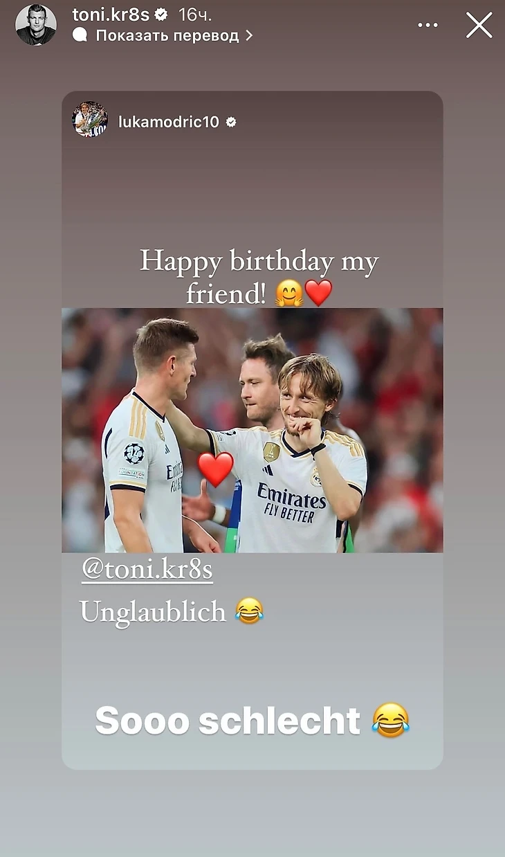 Модрич практикуется в немецком: «Невероятно». И получает ответ от Крооса: «Ооочень плохо».