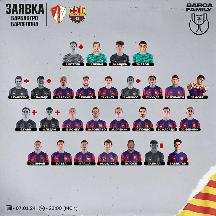 В заявку не попали: Марк-Андре тер Стеген – травма Жоау Канселу – травма Алехандро Бальде – дискомфорт Маркос Алонсо – травма Гави – травма Педри – травма Ламин Ямаль – дисквалификация (получил красную в молодежном матче кубка)
