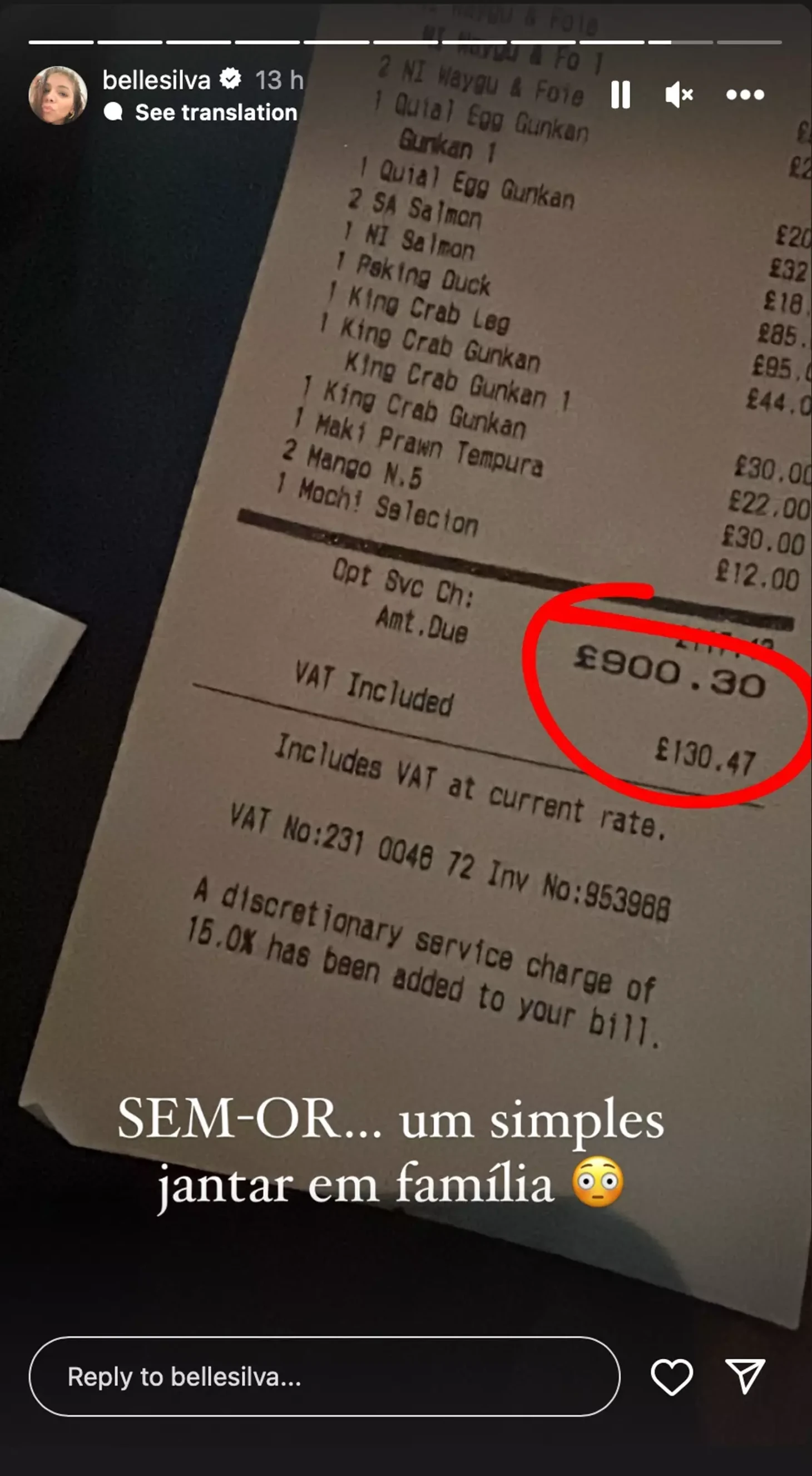 Изабель да Силва выложила в соцсетях фото, на котором виден суммарный счет за поход в заведение, а также названия некоторых блюд.