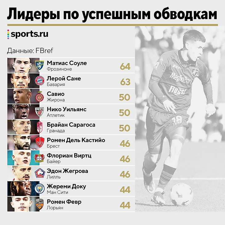 Больше всех обводит Соуле из 15-й команды Италии. За ним игроки «Баварии», «Жироны» и супердриблер Доку