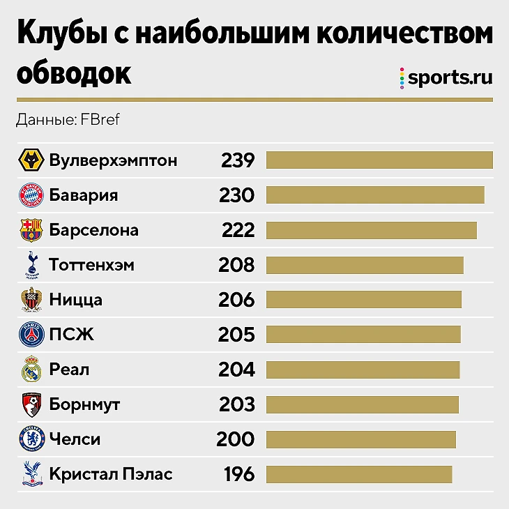 Из клубов в топе по обводкам... «Вулверхэмптон»! Только потом «Бавария» и «Барселона»